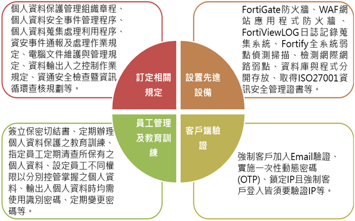 個資法第27條第1項規定,企業保有個人資料檔案者,應採行適當之安全措施,防止個人資料被竊取、竄改、毀損、滅失或洩漏。所謂「適當之安全措施」,依個資法施行細則第12條規定,係指企業為防止個人資料被竊取、竄改、毀損、滅失或洩漏,採取技術上及組織上之措施。企業得考量組織規模與保有個人資料之數量或內容,依比例原則建立技術上與組織上之措施。前述措施得包括下列事項,並以與所欲達成之個人資料保護目的間,具有適當比例為原則:一、配置管理之人員及相當資源;二、界定個人資料之範圍;三、個人資料之風險評估及管理機制;四、事故之預防、通報及應變機制;五、個人資料蒐集、處理及利用之內部管理程序;六、資料安全管理及人員管理;七、認知宣導及教育訓練;八、設備安全管理;九、資料安全稽核機制;十、使用紀錄、軌跡資料及證據保存;十一、個人資料安全維護之整體持續改善。謹例舉法院曾認定係適當安全措施之具體內容如下圖供參1: