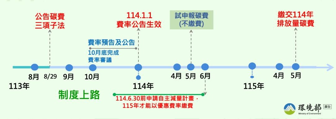 我國於2023年2月15日修正公布並開始施行《氣候變遷因應法》,為我國徵收碳費之法源依據,我國環境部並於2024年8月29日發布「碳費收費辦法」及「自主減量計畫管理辦法」,並公告「碳費徵收對象溫室氣體減量指定目標」,完成徵收碳費之三項配套子法,並同時宣布我國正式邁入碳定價時代。