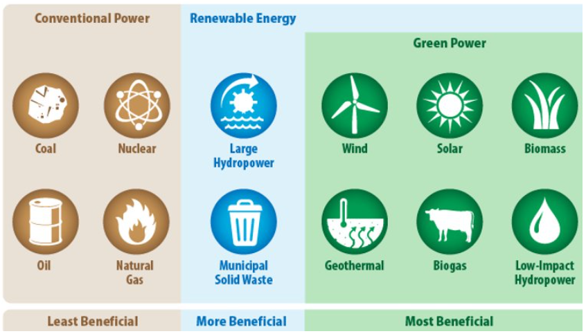 EPA認為綠色電力是再生能源的一個分支,再生能源則包括可在短時間內自我恢復且不會減少燃料來源的資源。此類燃料來源為我們所常見的太陽能、風能、流水(大型水力發電)、有機植物和廢棄物(符合條件的生質能)以及地熱能。EPA指出再生能源較擁有更多或巨大效益,但對於一些再生能源的技術可能會對環境產生影響。例如,興建大型水力發電廠可能會造成漁業或是土地利用等出現關於破壞環境等權衡問題,也可能造成不可回復性,因此興建時需要妥適的評估。