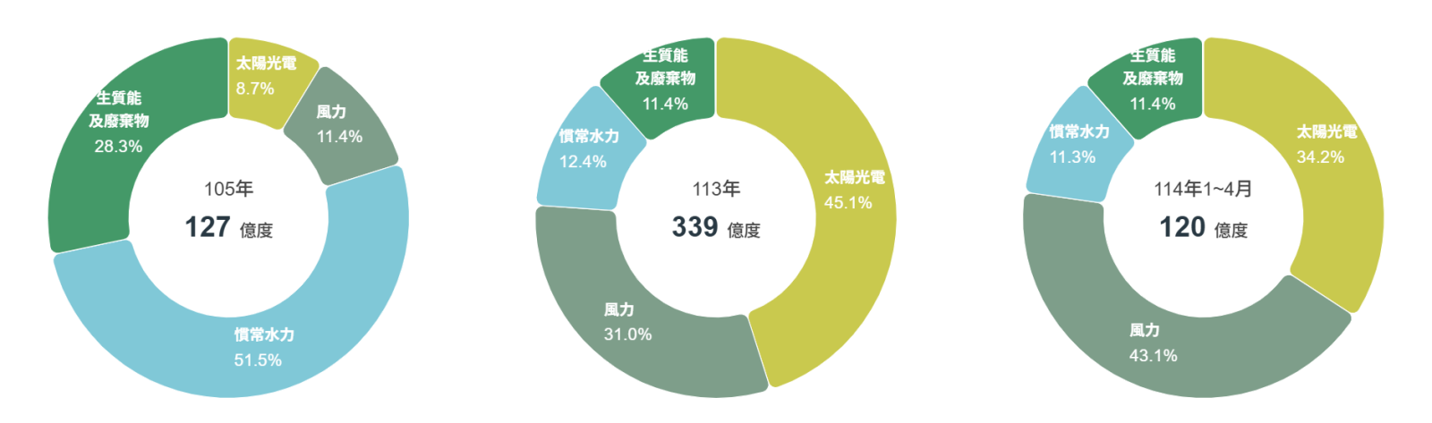 我國再生能源的主要發電來源為太陽能、風能、生質能與水力。從發電量結構(圖四)來看,2025年1月至4月間,再生能源發電裝置容量在所有發電容量中最高,但實際上再生能源發電量僅佔總發電量約14%,所產生的電力約為120億度電。其中,我國再生能源又以太陽能及風能發電為主力,合計發電量達93億度電,約佔再生能源總發電量的77.3%(圖五)。前述提及裝置容量與實際發電量之間有落差,主要是受到環境條件及時間等外在因素所影響。