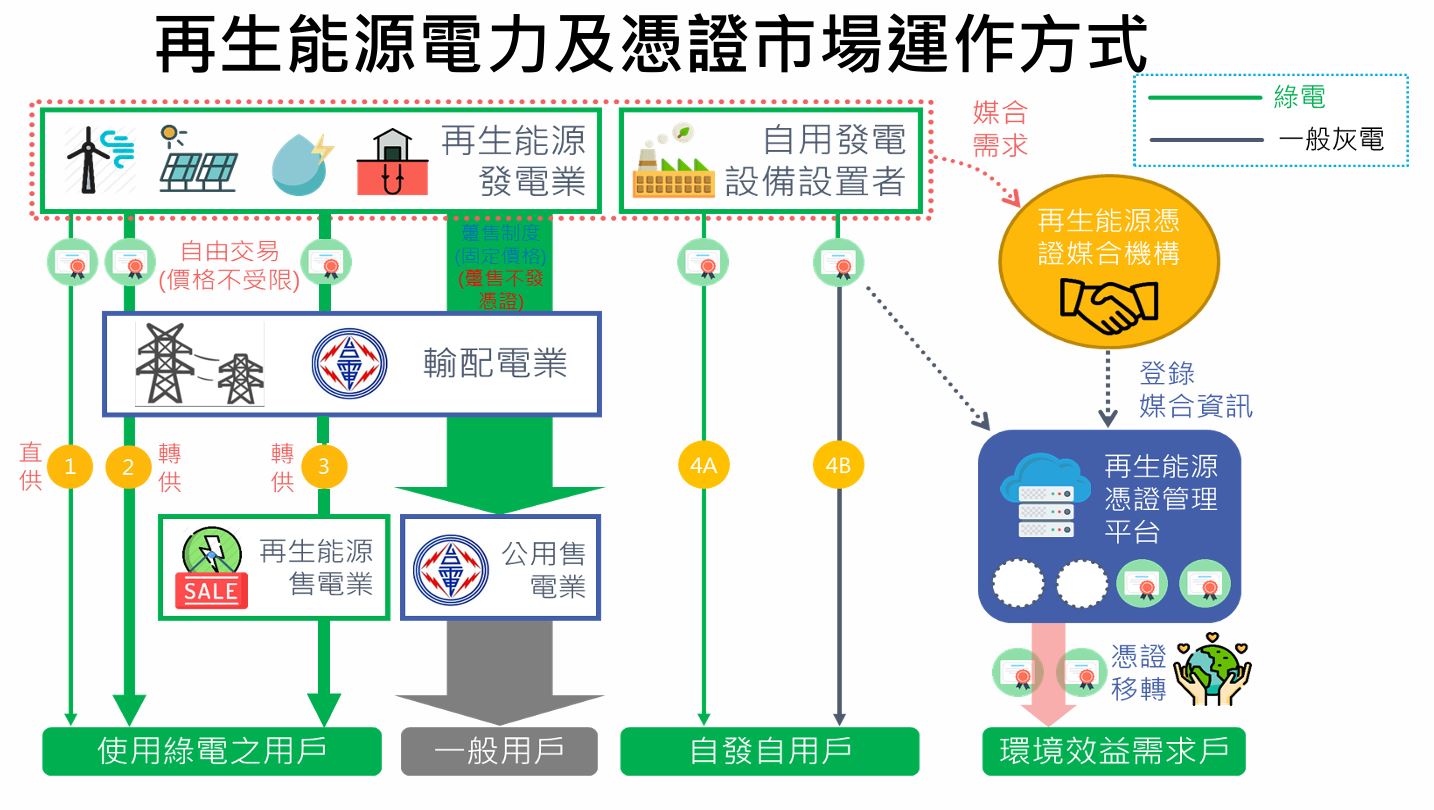 圖一、再生能源電力及憑證市場運作方式