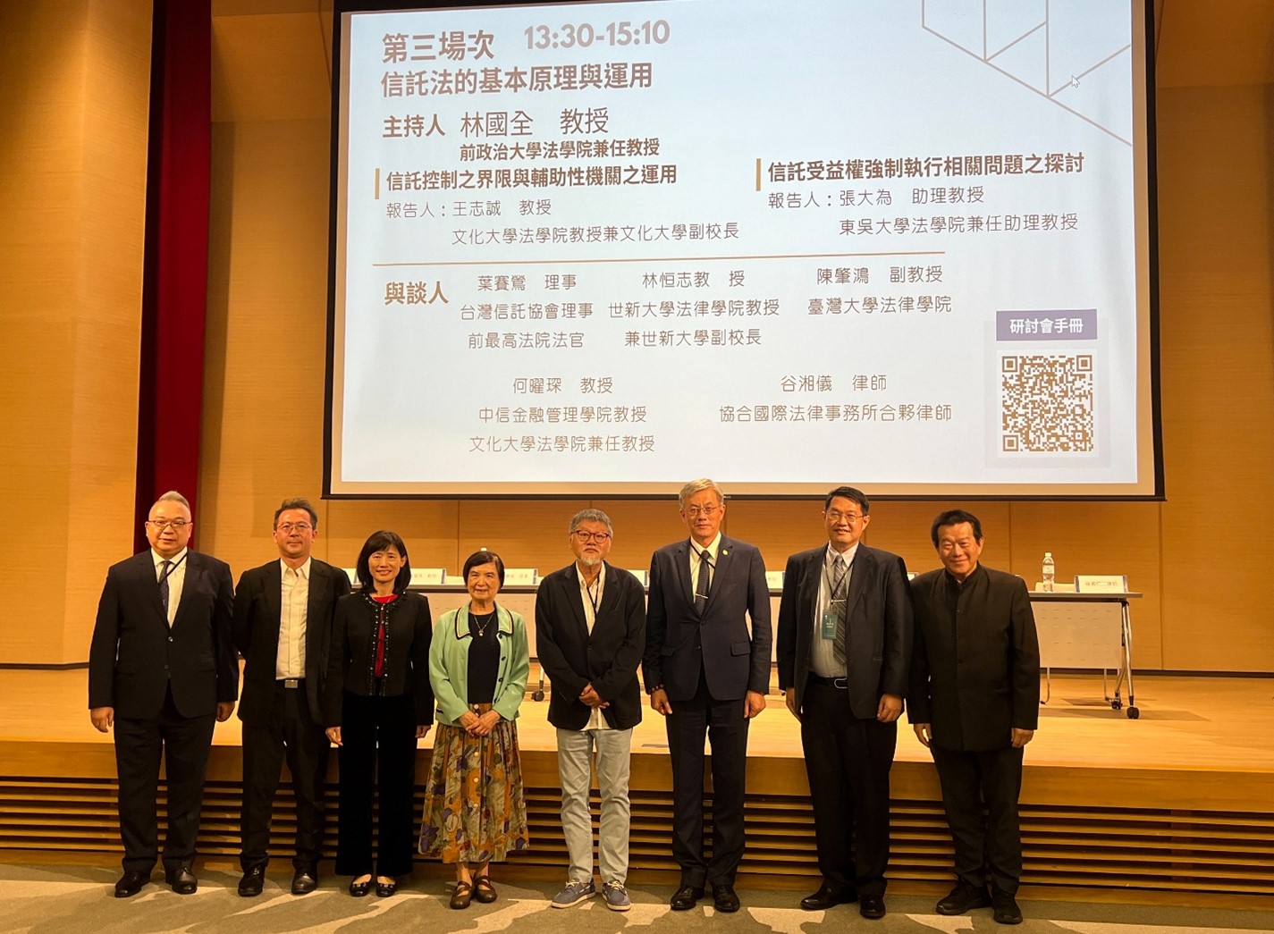 圖1:左起-中信金融管理學院教務長蔡惟均助理教授、本所所長金玉瑩主持律師、上海商業儲蓄銀行劉炳伸資深協理、台灣信託協會副主委方燕玲會計師、資誠聯合會計師事務所蔡怡歆會計師、政治大學法學院方嘉麟兼任教授、政治大學法學院副院長暨法科所所長葉啓洲特聘教授、安侯建業聯合會計師事務所洪銘鴻主持會計師