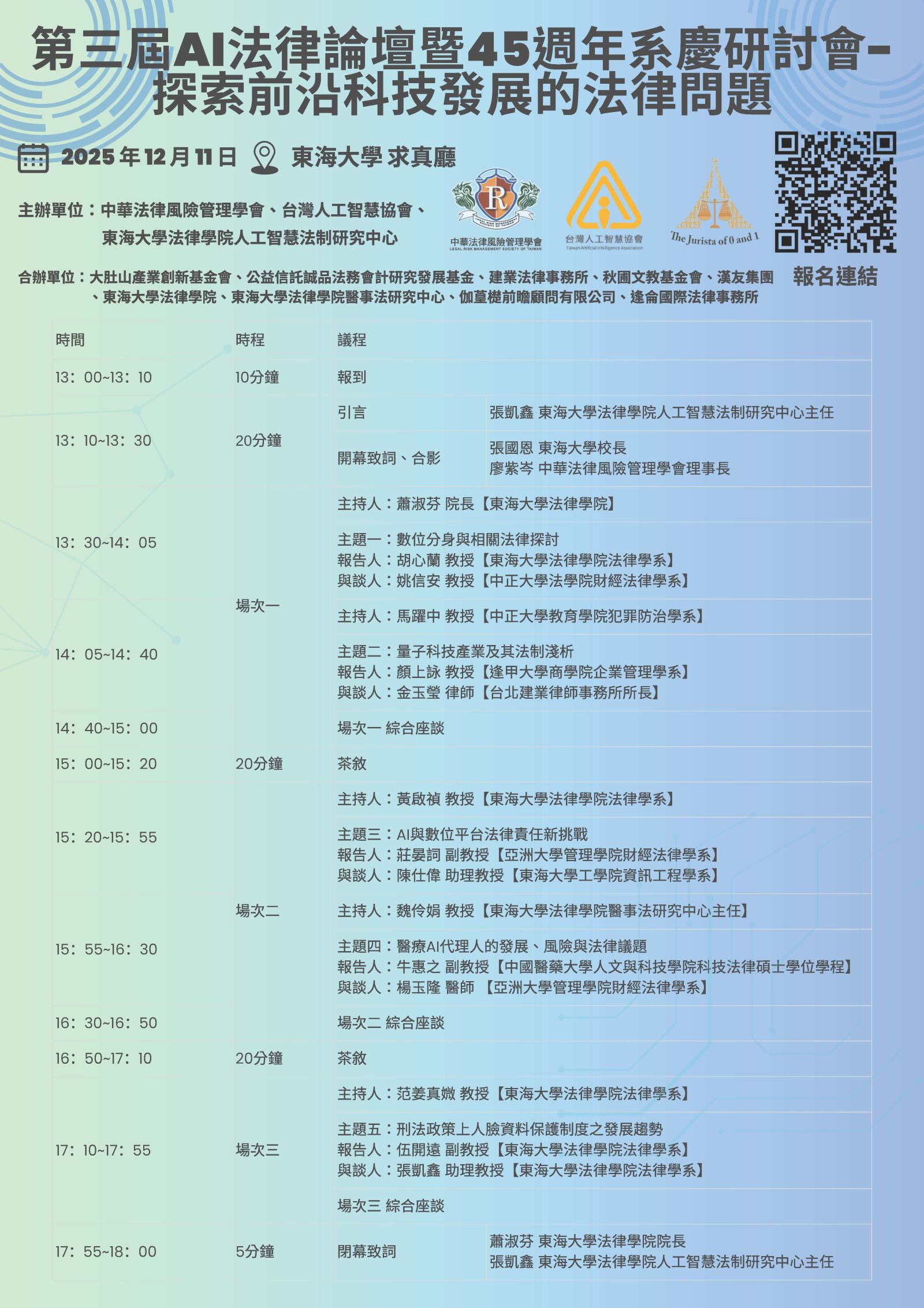 2025年12月11日於東海大學求真廳舉辦之「第三屆AI法律論壇暨45週年系慶研討會」,本所所長金玉瑩主持律師受邀擔任第一場次「量子科技與法律的對話-制度準備與風險因應」與談人。